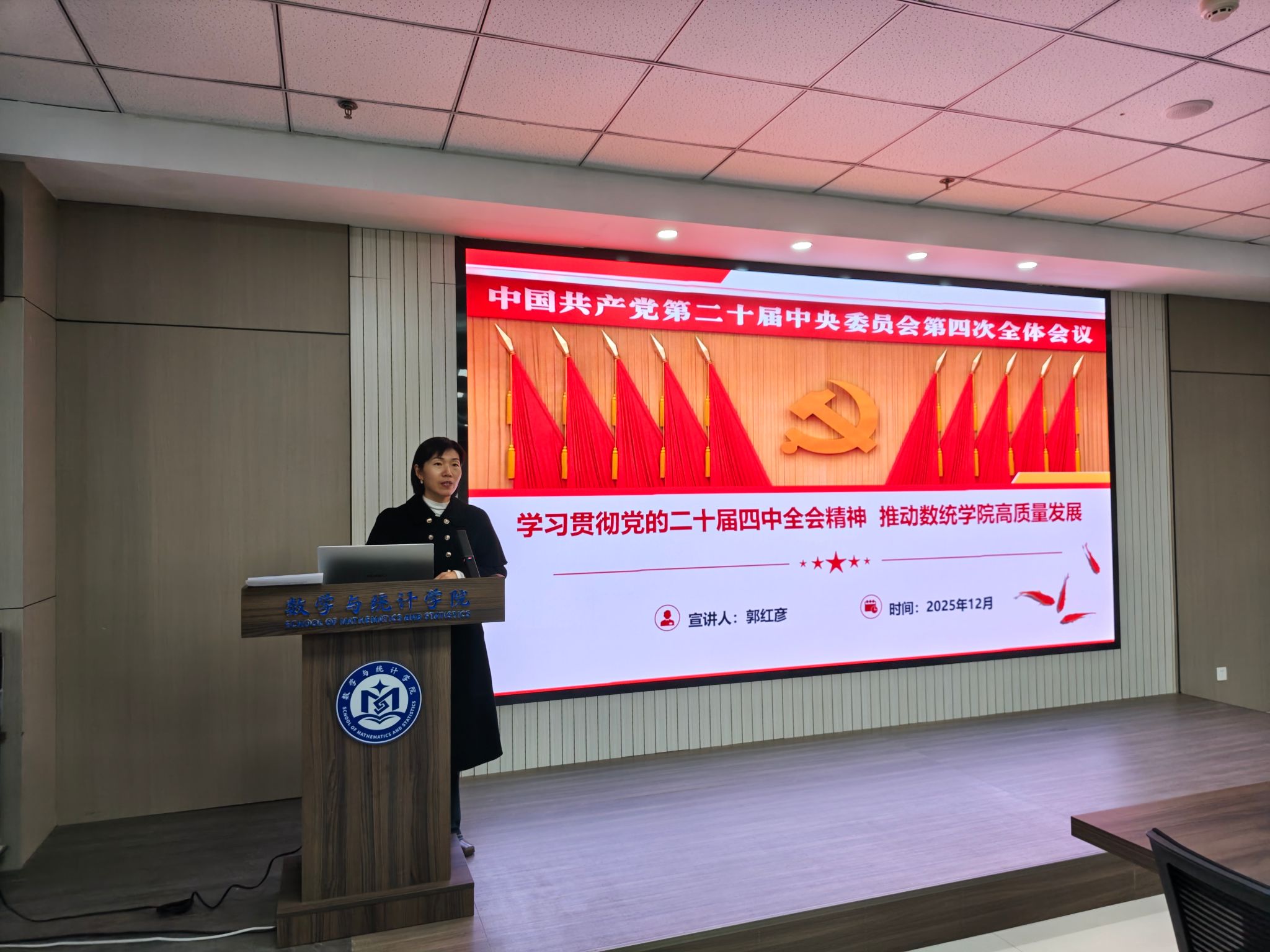 郭红彦以《学习贯彻党的二十届四中全会精神 推动数统学院高质量发展》为题作专题宣讲。她从党的二十届四中全会的深刻内涵,党中央为何如此重视“十五五”规划编制,“十四五”时期我国取得的主要成就和经验启示,党的二十届四中全会描绘的未来发展蓝图,贯彻落实党的二十届四中全会精神,推动学院事业高质量发展等五个方面,对党的二十届四中全会精神作了阐释。她指出,贯彻落实党的二十届四中全会精神,推动学院高质量发展,主要要做好三个方面工作:一是认真做好学院“十五五”发展规划,客观科学谋划学院未来五年发展蓝图;二是立足立德树人根本任务,高质量做好人才培养;三是结合学校目标管理考核,抓住重点工作任务,集中力量求突破。