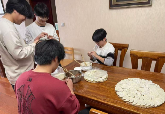 2024级数学二班的同学们在班主任赵艳的热情邀请下来到其家中,体验了一场充满家庭氛围的冬至包饺子活动。赵艳提前准备了丰富的食材和工具,同学们分成小组,从和面、擀皮到调馅、包饺,每一个环节都充满了欢声笑语。赵艳一边指导同学们包饺子的技巧,一边向大家讲解冬至的传统文化内涵:“冬至不仅是节日,更承载着团圆、感恩的文化意义。希望通过这样的活动,让同学们在异乡也能感受到家的温暖。”
