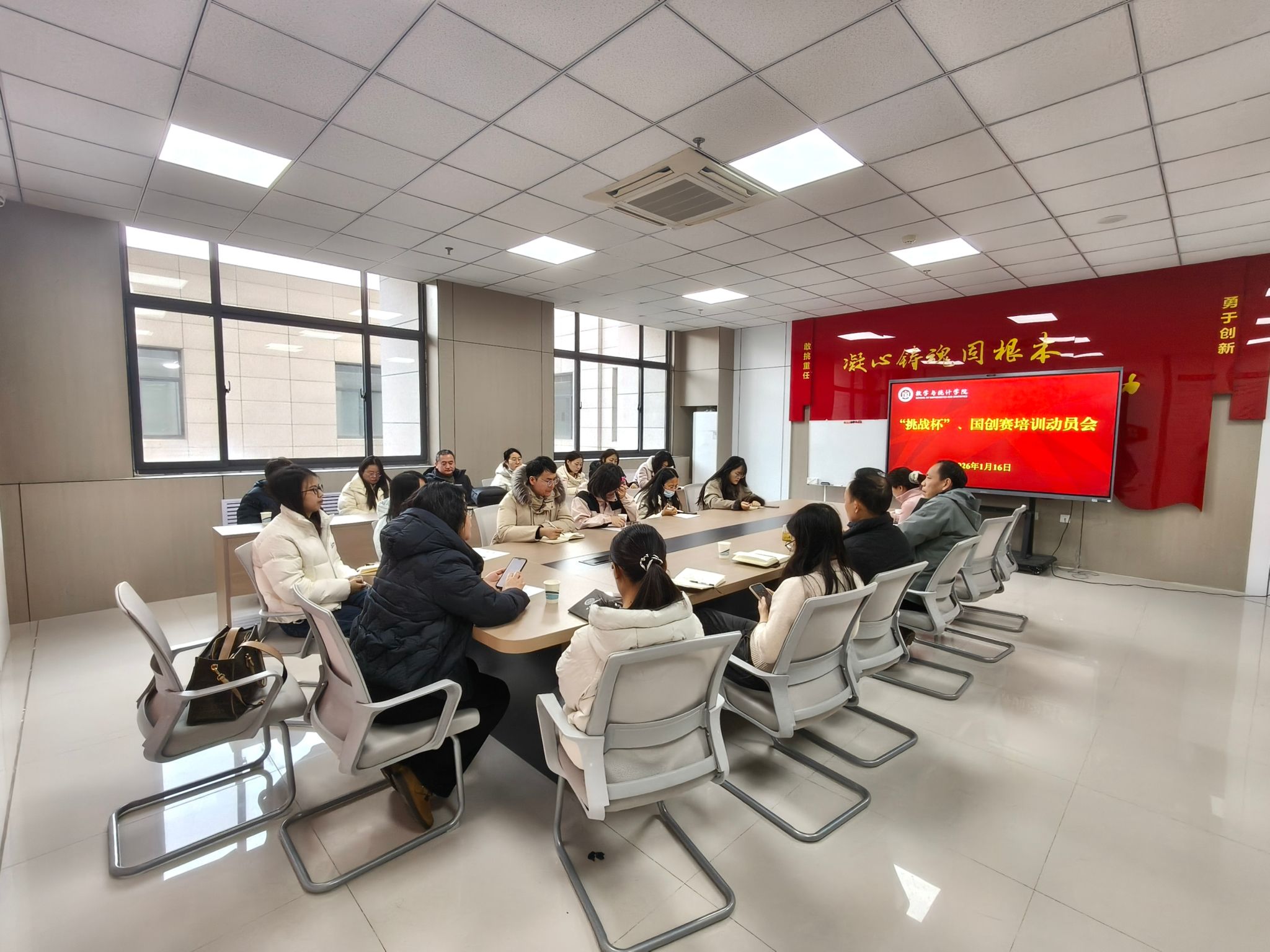 为深入贯彻落实立德树人根本任务,强化学生创新实践能力培养,凝聚学科师资力量备战各类创新创业赛事,1月16日上午,黑料不打烊 于惟德楼317-2党员之家召开“挑战杯”“国创赛”动员培训会。学院党委副书记程凯、团委书记刘姗、24年和25年新进博士、统计教研室教师参加会议,会议由团委书记主持。