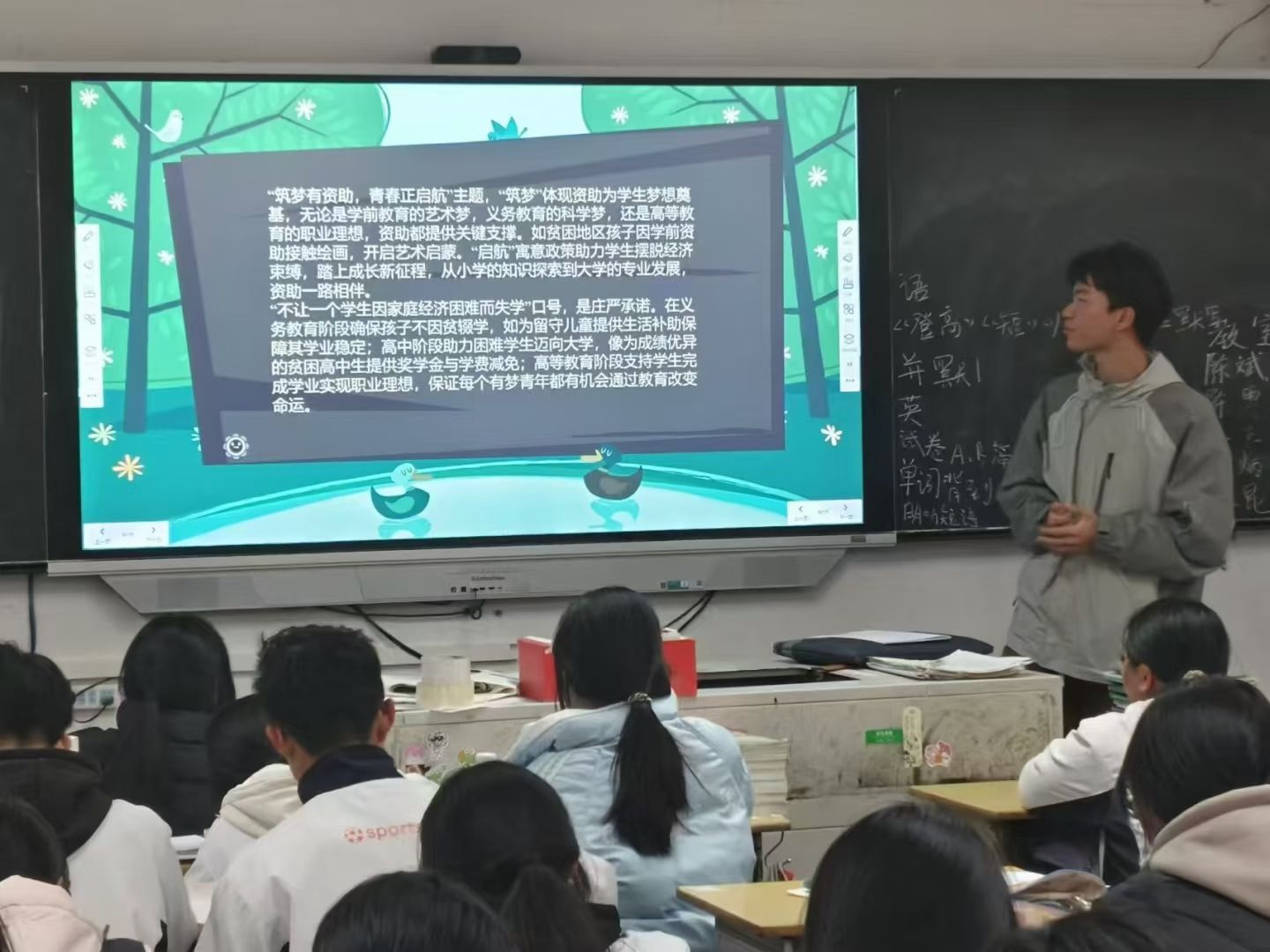 宣传片、发放政策手册、答疑解惑等方式,系统介绍国家奖学金、助学金、生源地贷款等项目的申请条件与办理流程。讲解者更是以“受益者”与“过来人”的双重身份,不仅讲透政策,更讲活故事——通过分享自身从申请资助到励志成长的真实经历,生动展现了如何借助政策支持解决学费、生活费等实际困难。真挚的分享有效缓解了在场学子的经济顾虑,点燃了高中生们对大学生活的向往与信心,现场互动热烈,反响积极。
