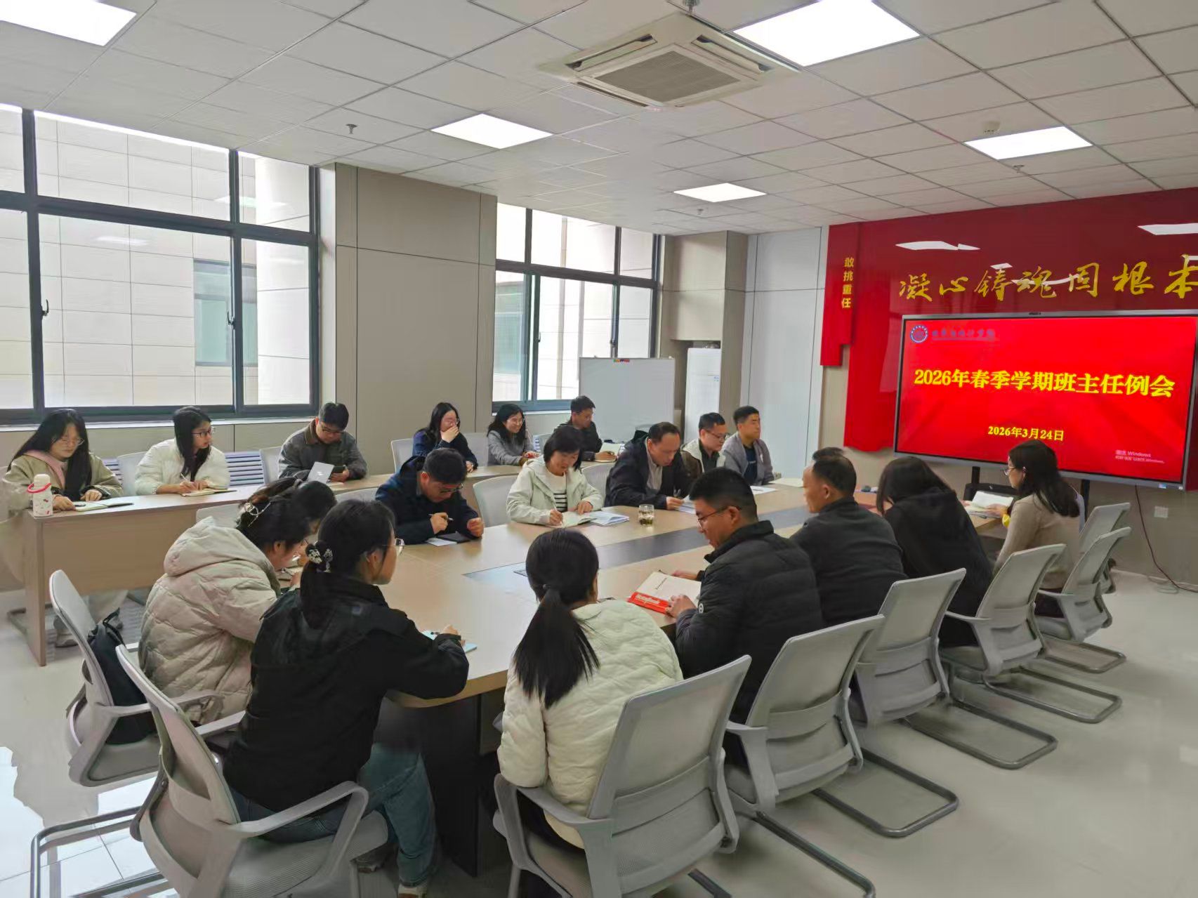 春季学期班主任工作例会在惟德楼317会议室召开。学院党委书记郭红彦、党委副书记程凯、各年级辅导员、全体班主任参加会议。