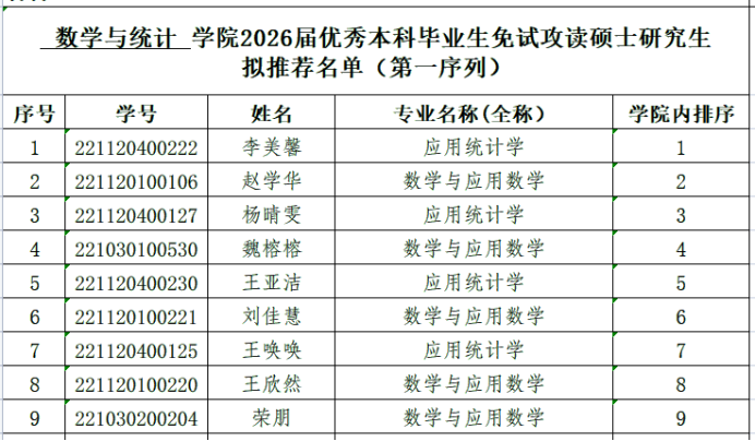 推荐优秀应届本科毕业生免试攻读硕士学位研究生工作执行方案》的相关规定,经学生自愿申请,学院推免生遴选工作小组考察审核审定,我院拟推荐2026届优秀应届本科毕业生免试攻读硕士学位研究生名单公示如下(排名有先后):