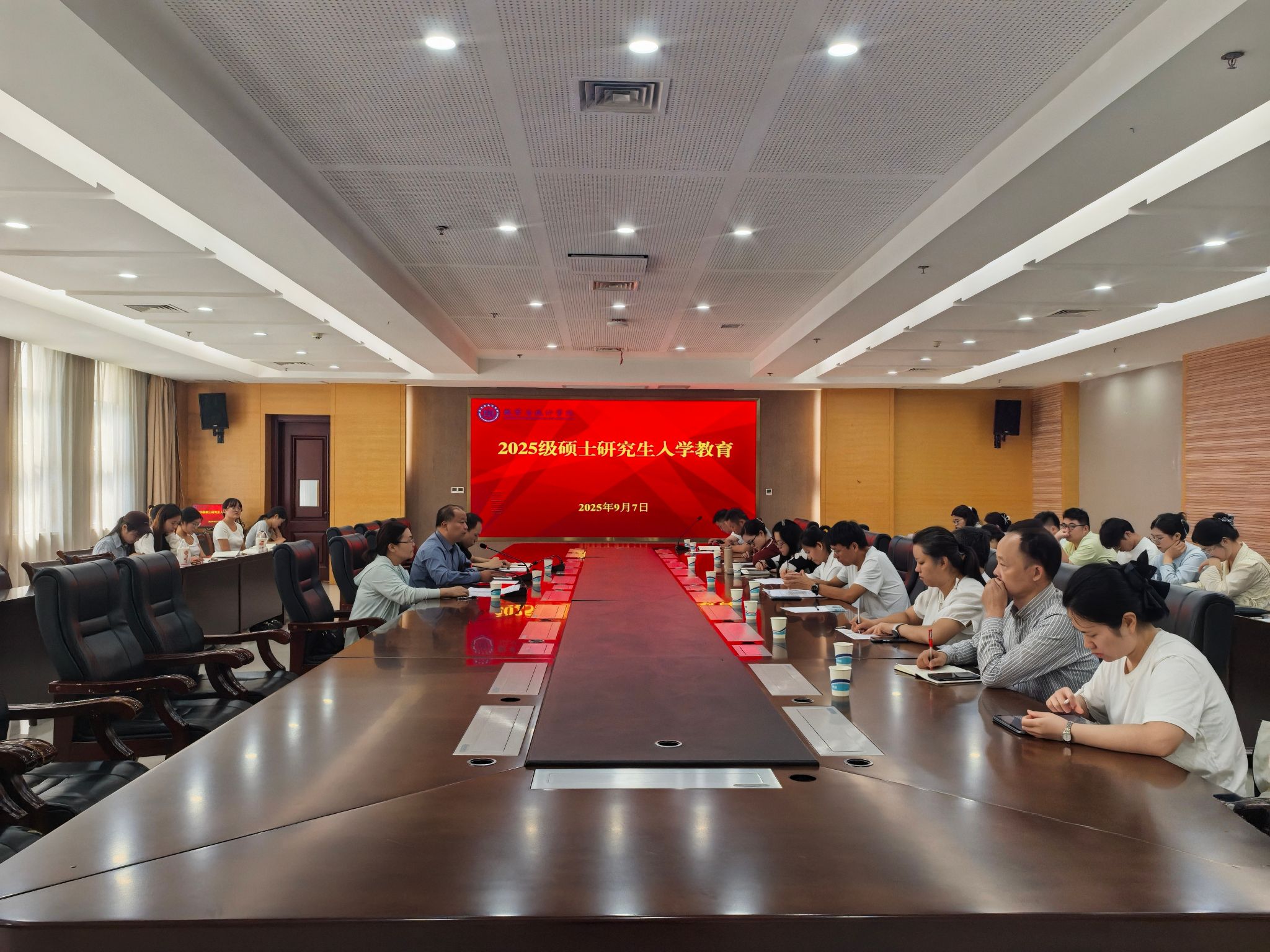 于行政楼D203会议室举行了2025级硕士研究生入学教育大会暨资格审查面试复测。本次活动旨在帮助新生尽快适应研究生生活,明确学习目标与学术规范,并严格把关入学资格。学院院长谷存昌、党委副书记程凯、副院长曹建莉,2025级硕士研究生导师及全体新生参加此次活动。