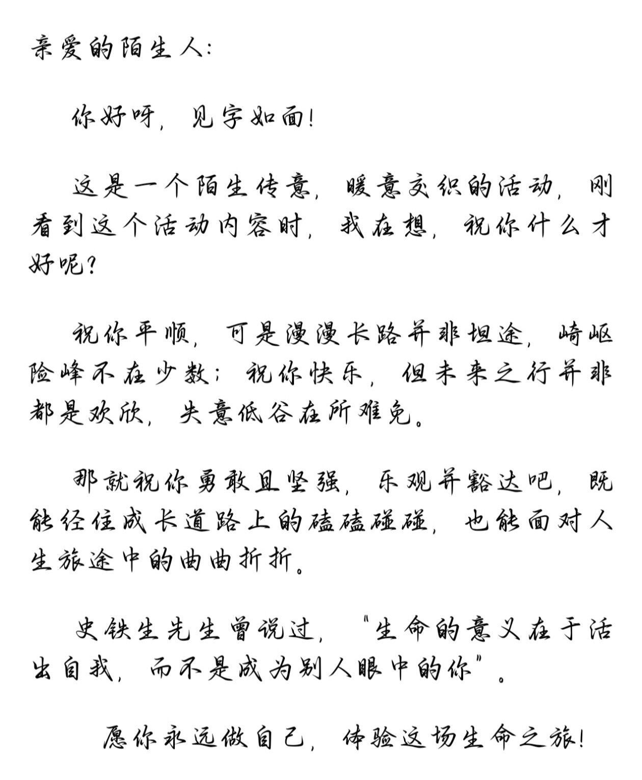 在快节奏的现代生活中,人与人之间的交流逐渐变得匆忙且疏离,陌生人之间往往缺乏深度互动与温暖传递的契机。为了打破这种隔阂,营造充满善意与关怀的社交氛围,我院于11月10日至14日开展了“陌声传意,暖意织心”主题活动,鼓励同学们以文字或图文的形式传递祝福,在送出与收获温暖的双向互动中,感受来自陌生人的善意与慰藉。“陌声传意”,是打破心墙的勇气;“暖意织心”,是情感流动的成果。我们相信,每一次微小的连接,都能汇聚成照亮彼此生活的光芒。